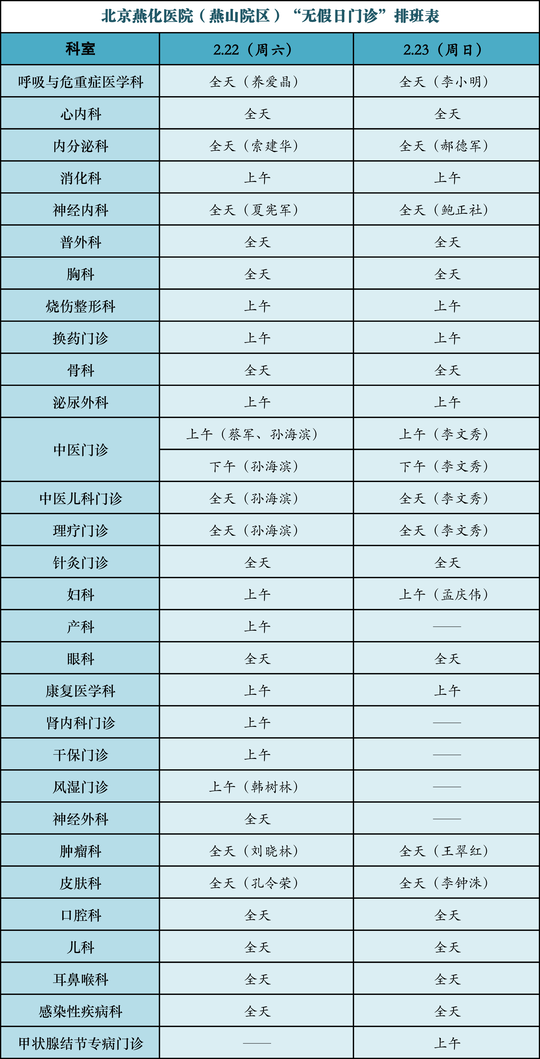 为全力保障百姓就医需求,北京燕化医院继续推行“无假日门诊”。部分科室及出诊专家会有所调整,快来看看有没有您想要咨询的医生!