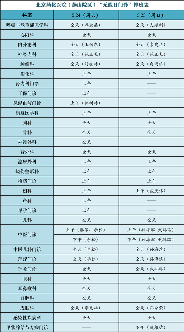 现将本周末(2025年5月24日-25日)“无假日门诊”安排表公布如下: