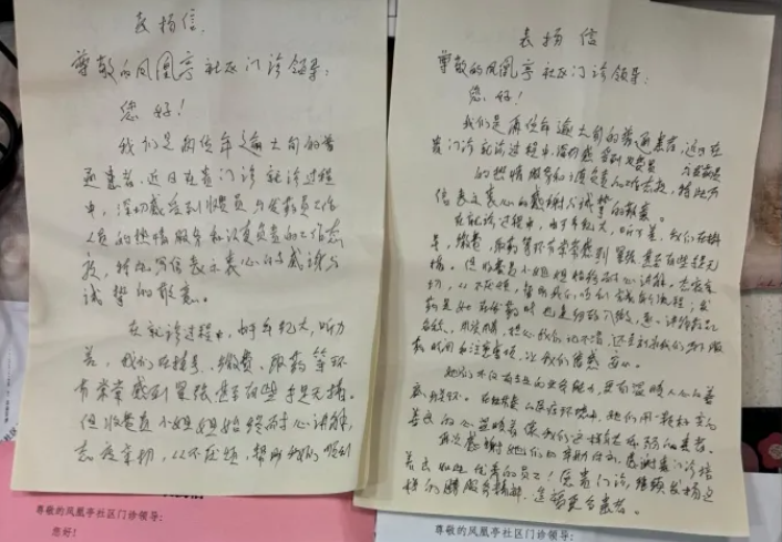 被选择是一种信任,被认可是一种幸福。感谢患者送来的表扬信,这不仅是对我们的荣誉与责任,更是对工作的赞许与认可。我们将继续用心服务每一位患者,尽心做好每一件事,发扬这种服务精神,造福更多患者。这份源自社会、超越亲情的暖意关怀,为我们带来了一丝清凉,也让凤凰亭社区的医患关系更加和谐融洽。