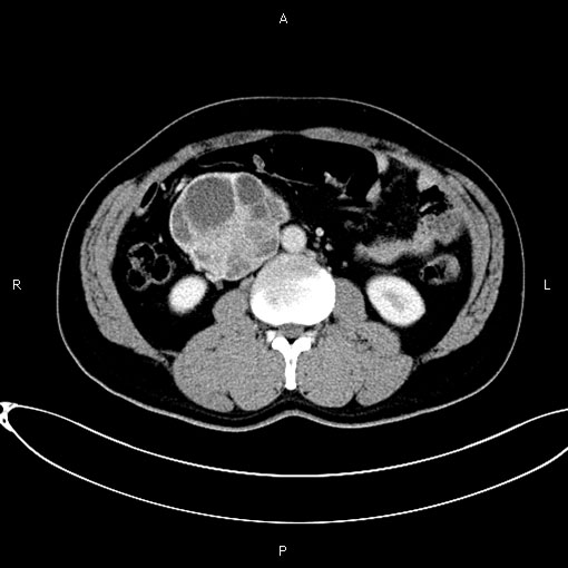 患者张某,男,44岁,主因“发现腹膜后肿物两周”入院。CT显示:右侧腹膜后团块灶囊性部分未见强化,实性部分及囊壁、分隔可见明显强化。最大截面约20×15cm,形态欠规则,边界清晰,其内见分隔影,邻近下腔静脉受压显示不清。