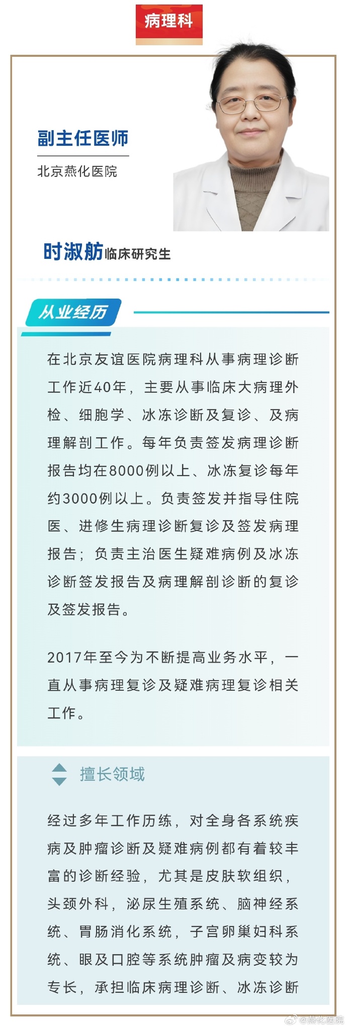 为给广大患者提供精准、便捷、高效的就诊服务,北京燕化医始终致力于打造一支医术精湛、医德高尚的专家团队,积极整合名医资源,将众多在各医学领域深耕多年、建树颇丰的专家齐聚我院,让百姓在家门口就能享受到和三甲医院一样的优质医疗服务,照亮患者康复的希望之路。本期隆重推出的是病理科专家。(主要展示主任医师及副主任医师,更多医师简介请来院咨询)。让我们一同走进这些专家,领略他们的风采。