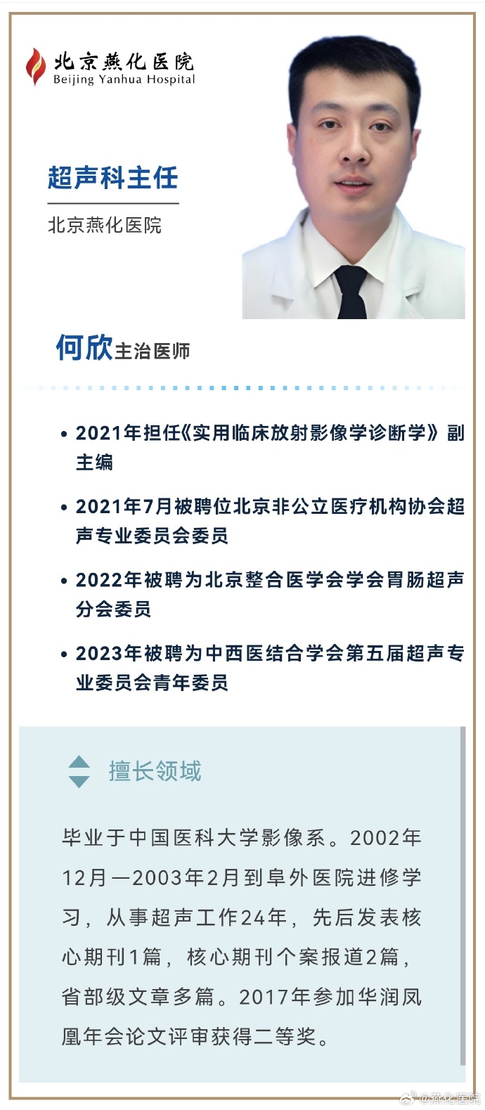 为给广大患者提供精准、便捷、高效的就诊服务,北京燕化医始终致力于打造一支医术精湛、医德高尚的专家团队,积极整合名医资源,将众多在各医学领域深耕多年、建树颇丰的专家齐聚我院,让百姓在家门口就能享受到和三甲医院一样的优质医疗服务,照亮患者康复的希望之路。本期隆重推出的是超声科专家。(主要展示主任医师及副主任医师,更多医师简介请来院咨询)。让我们一同走进这些专家,领略他们的风采。