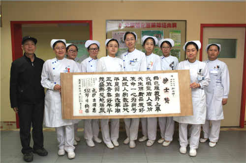 4月25日的清晨,燕化医院神经内科迎来了曾经在我科住院的患友张阿姨的老伴。老人家向我们递上了自己亲手书写的四幅书法作品,以此来表达对神经内科医护人员的感谢之情。四幅书法作品中都包含藏头诗,分别是“白衣天使风华正茂”、“刘研辛苦为救病人”、“红艳同志姐妹青春似火”和“神经内科医德高尚”!
