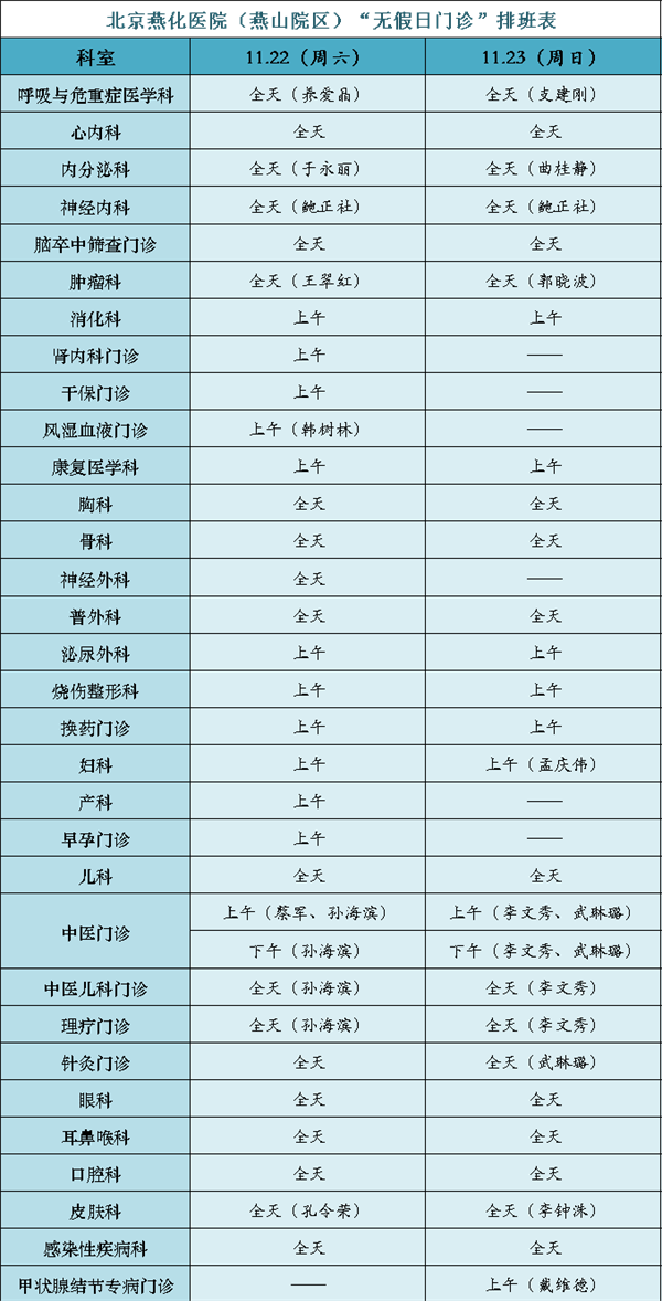 为全力保障百姓就医需求,北京燕化医院继续推行“无假日门诊”。部分科室及出诊专家会有所调整,快来看看有没有您想要咨询的医生!现将本周末(2025年11月22日-23日)“无假日门诊”安排表公布如下: