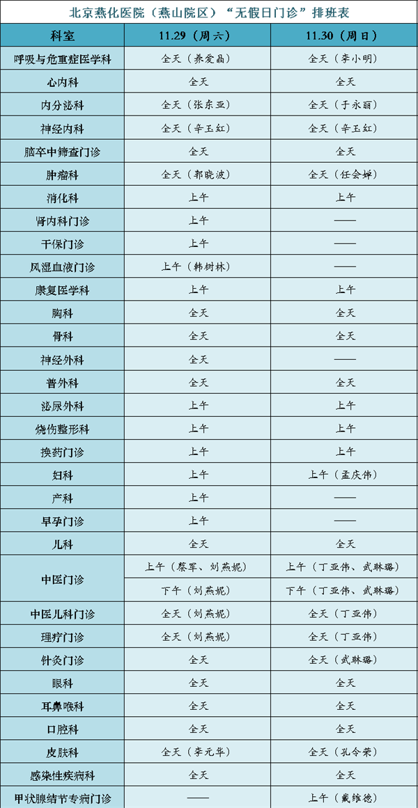 现将本周末(2025年11月29日-30日)“无假日门诊”安排表公布如下: