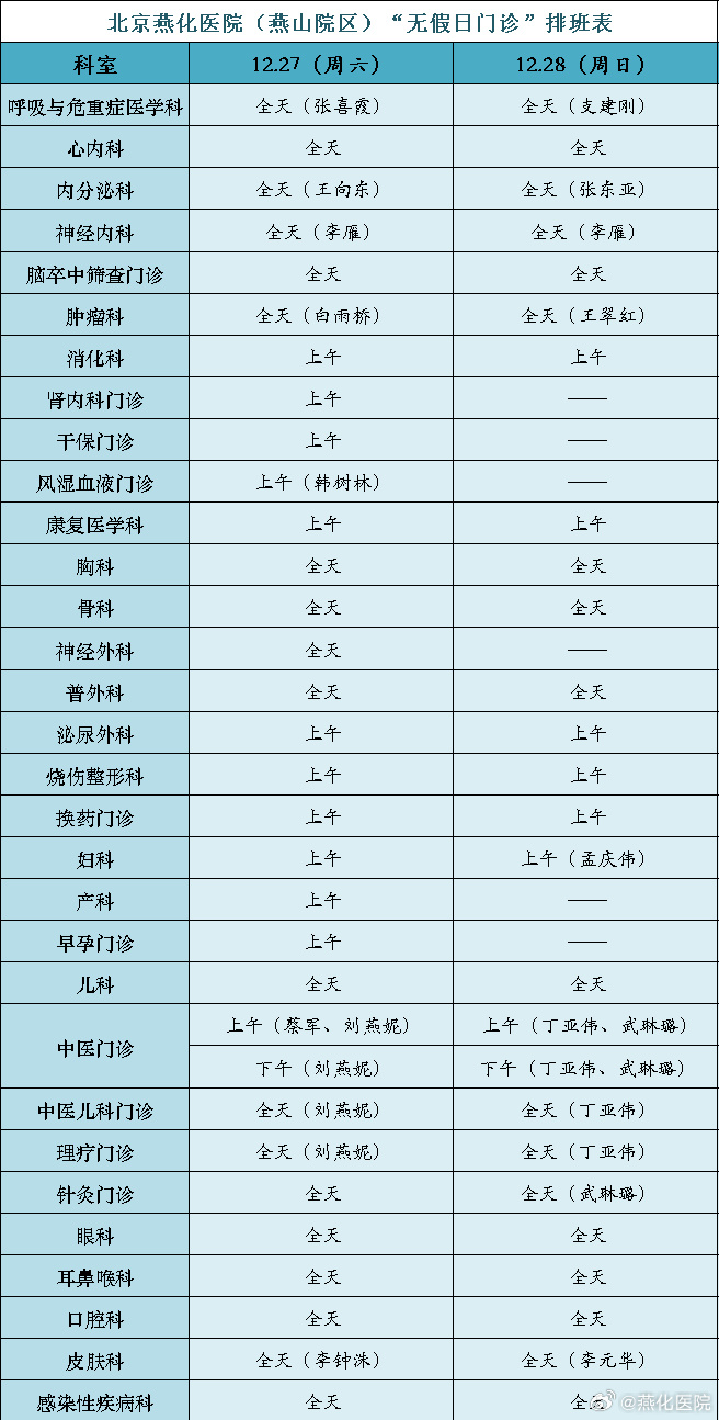 现将本周末(2025年12月27日-28日)“无假日门诊”安排表公布如下图: