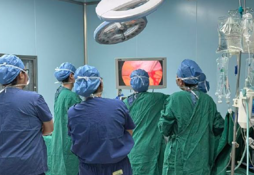 全麻迅速生效,腹腔镜探入腹腔,眼前的景象触目惊心:患者右侧输卵管已完全破裂,大量鲜血与凝血块充斥腹腔,出血量远超术前预估。王秋翠主任沉着指挥,手术团队各司其职、默契配合:一边通过腹腔镜器械快速抽吸积血、启动自体血回输系统,一边在清晰的内镜视野下精准分离病灶组织,避开周围重要血管与脏器,稳步实施右侧输卵管切除术。术中还意外发现患者左侧输卵管系膜存在一枚囊肿,为避免患者二次手术创伤,在确保安全的前提下,顺势完成囊肿剔除术,实现了“一次手术、双重治愈”的精准救治。