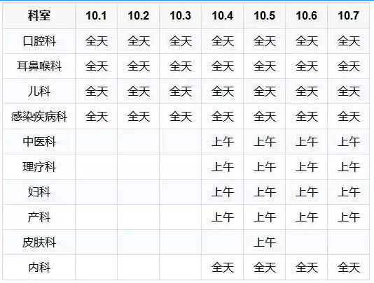 为方便广大患者朋友节日期间就医,我院就2016年10月1日—10月7日期间门诊出诊时间安排如下: