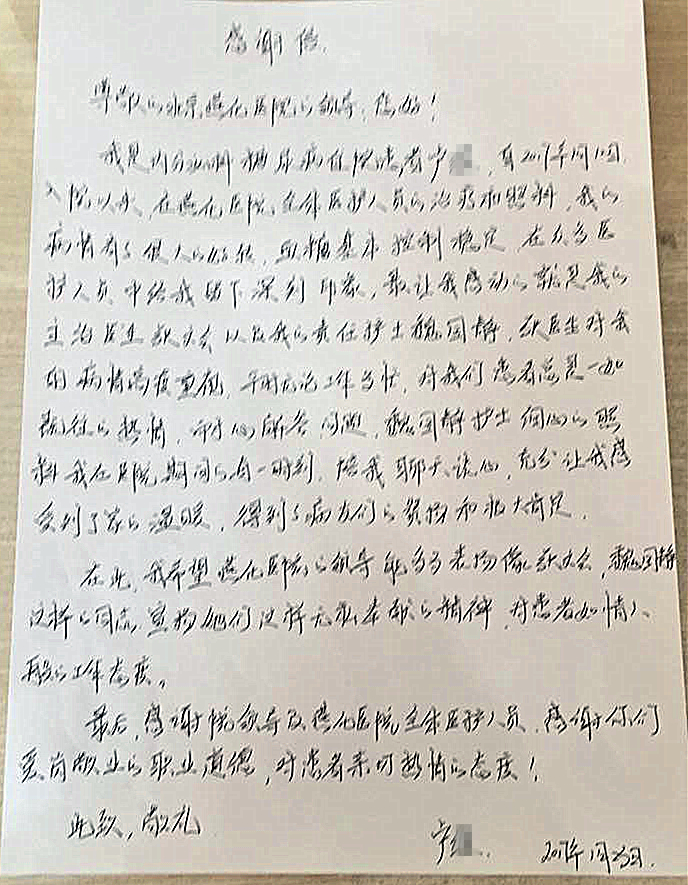 上一篇: 患者家属杜女士表扬呼吸科医护人员对病人宽容关爱、悉心照护