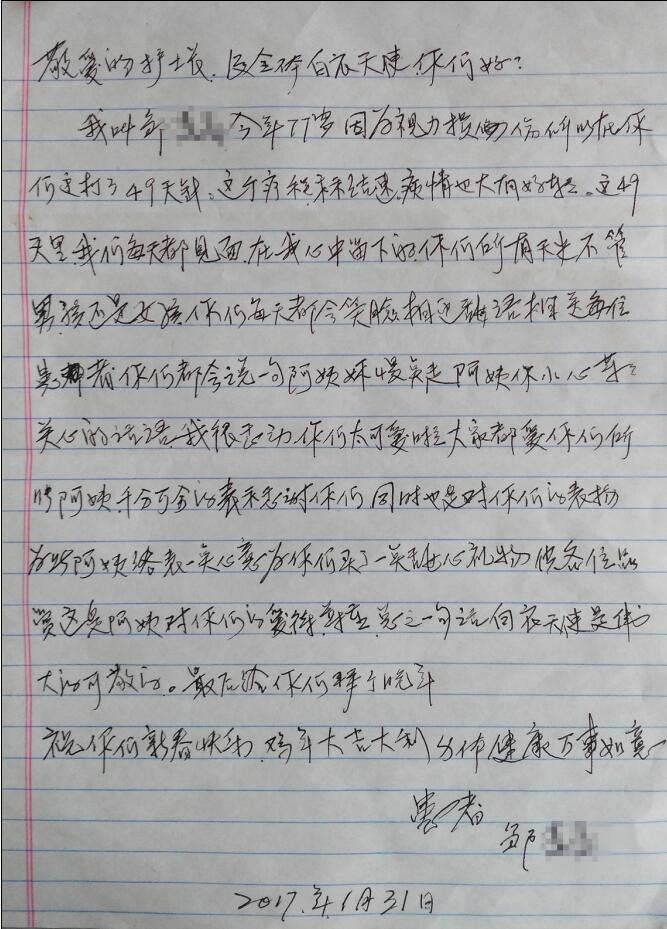 下一篇: 患者家属杜女士表扬呼吸科医护人员对病人宽容关爱、悉心照护