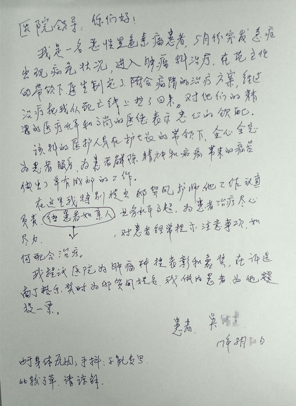 北京燕化医院肿瘤科病房里,70多岁的吴大爷用颤抖的双手写下了一封简短的感谢信,虽然字迹有些潦草,却满含深情。