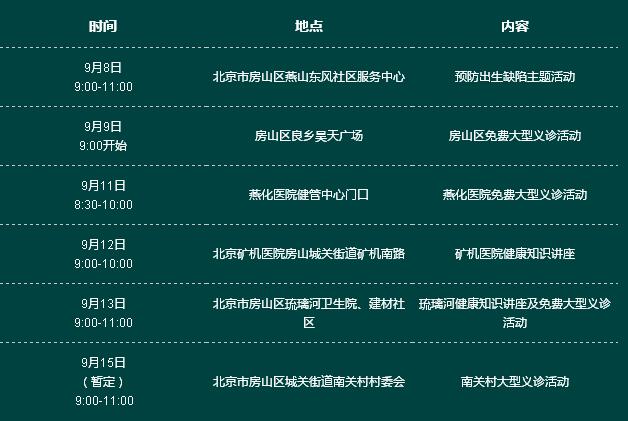 北京燕化医院将于9月9日起,在各地区为广大居民开展为期一周的大型科普讲座及义诊活动。届时会有三级医院权威专家莅临现场为群众开展健康咨询服务,并提供免费测血压、测血糖服务。