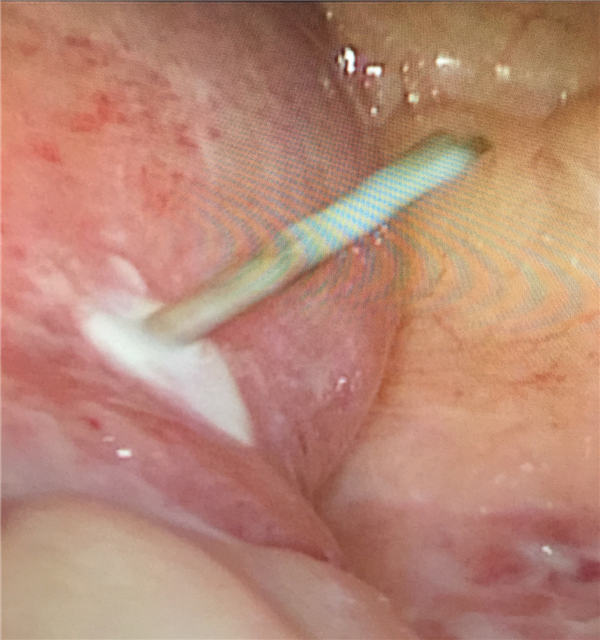 经过一系列常规检查后,发现腹部有异物,由普外科收治入院。为尽快解除患者病痛,普外科决定立即为他行全麻下腹腔异物取出术。手术由普外科主任陈安良、医生何永健和孙涛进行。在肚脐下缘行1cm切口。术中发现李先生腹腔中有大约50ml脓性积液,在距屈氏韧带100cm处发现一大小约0.2cm的破口,并发现一根似鱼刺样尖锐异物。