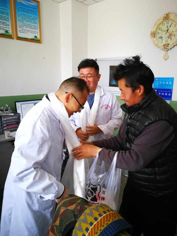 半个月前,一个老大哥一瘸一拐来到医院,X线检查发现其左足跟深部有0.2x0.3cm大小的薄铁片。异物很小,但我们没有小看它,因为我们深知异物越小就越不好找。术前我们援藏五人组坐在一起讨论制定手术方案,因为手术室没有C型臂等透视设备,术前CT下定位做体表标记尤为重要。我和欧珠麻醉后手术开始了,沿着标记线探查下去,由于异物很小很薄,又在组织深层,导致盲探两个小时后仍无法找到异物。盲探不行怎么办?大家陷入沉思。王延庆想到超声定位,台下帮忙的唐莉鸿和陈洁赶紧协调B超室送来了B超。应用超声进行各种穿刺定位是麻醉科的强项,于是我戴上手套亲自操作B超,在超声引导下利用平面内技术把神经穿刺针直接扎到异物表面。李旭彤通过寻找针尖的位置,一下就找到了铁片。这铁片那么小,却是我们共同努力的结果。病人出院了,给我们医疗队献上哈达,给每个安吉拉(医生)倒上一杯亲手打的酥油茶。深秋的寒风中,热腾腾的酥油茶不仅温暖着我们的心,更是激发了我们的战斗力——这就是我们值得为之付出的家乡父老!