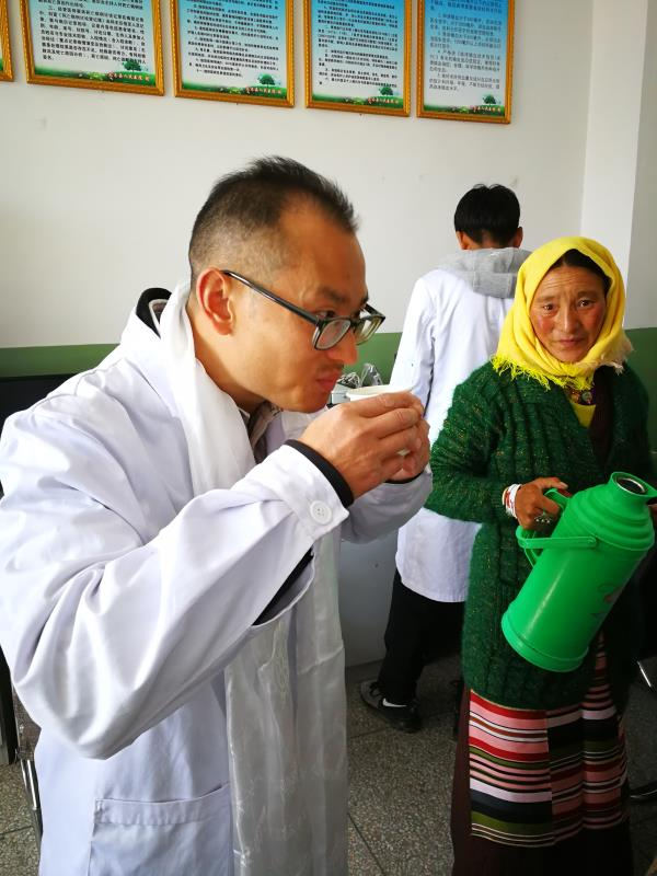 这是一个有凝聚力的集体。尼木是贫困县,除了山区就是牧区,交通非常不便,贫困人口相对较多。三个老大哥都有扶贫结对户,不管是翻越4500多米的高山去吞巴乡吞达村仅有六户人家的鲁热组,还是就近去尼木乡,每次去看望贫困户,都会有支部的一两个医生随行,给他们送米面粮油的同时,也进行义诊。我们支部不仅仅关心他们的生活状况及生产情况,同时也密切关注他们的身体健康。贫困户嘎玛桑姆嬷拉(老奶奶)已经80多岁了,时常觉得头晕,在了解她的生活没有后顾之忧后,我们给她进行体检发现,她的血压在规律服用复方利血平片后还高达175/100mmHg,急需更换降压药物。我们及时和尼木乡村医沟通,在了解尼木乡卫生所的药品结构后,制定了下一步的治疗方案,并和嬷拉及其亲属详细说明了用药方法和注意事项,嘱咐村医定时监测嬷拉的血压,同时留下电话号码随时保持联系。临别前,当支部赵书记问嬷拉还有什么心愿时,她紧紧拉着我们的手,眼含泪水说到:“我没什么心愿了,做梦也想不到能过上这样的日子,感谢毛主席,感谢共产党,祝愿你们永远不生病,扎西德勒(藏语:表示欢迎、祝福吉祥的意思)!”多么朴实的话啊,却把我们支部八个人的心拉得更紧了。