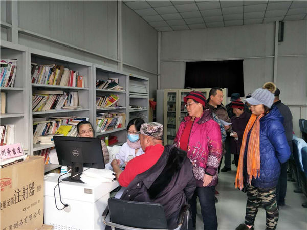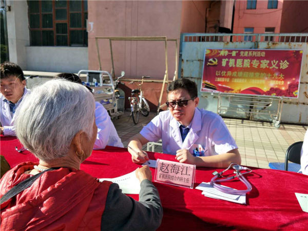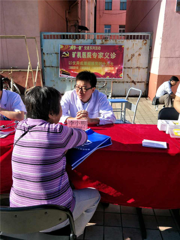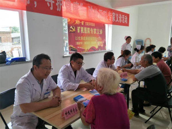 供老人们娱乐的俱乐部里、楼前搭建的凉棚下、道边楼前的台阶上、社区门口的棋摊旁……任何一个有居民活动的地方,都少不了矿机医院医护人员的身影。