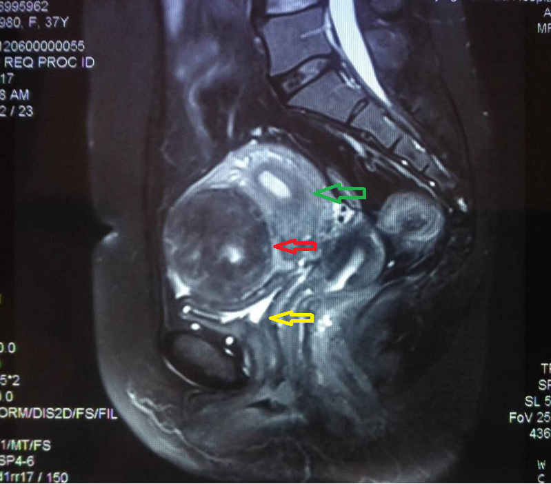 上图中,红色箭头所指为子宫前壁巨大子宫肌瘤,绿色箭头所指为子宫,黄色箭头所指为被子宫肌瘤压迫的膀胱。