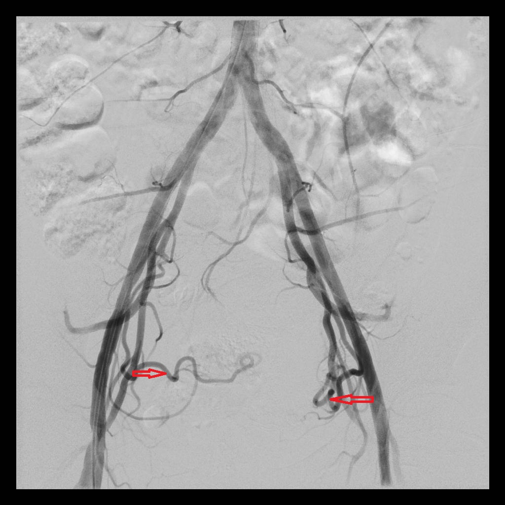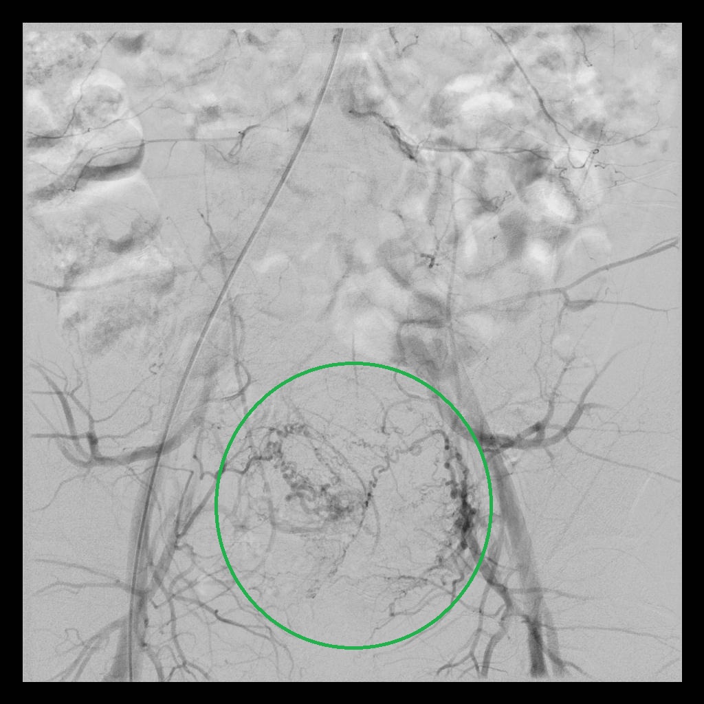 后经腹部主动脉造影显示,子宫双侧的子宫动脉均有增粗、迂曲的情况(下图中红色箭头所示),子宫和子宫肌瘤也均有所增大(下图中绿圈所示)