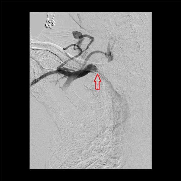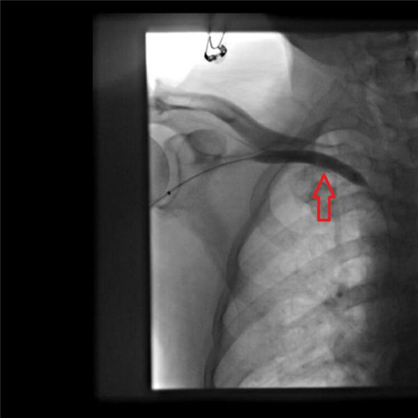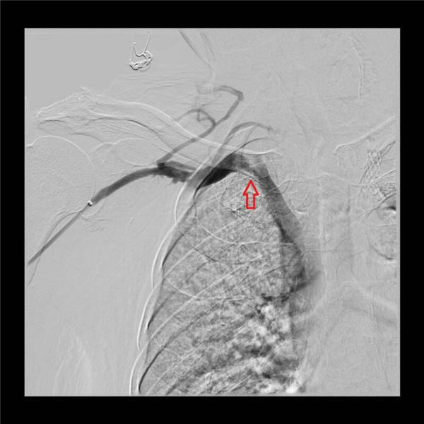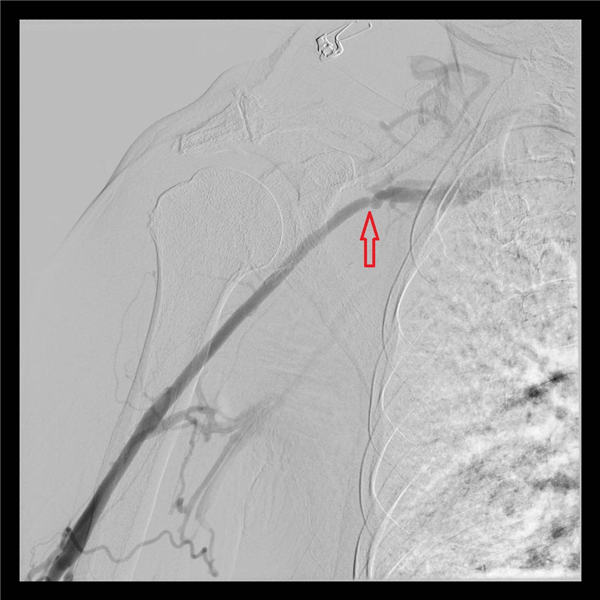 陈力强和赵庆和两位主任经过精心研讨方案,首先通过血管造影,发现右上肢动静脉瘘到上腔静脉共有三处血管明显狭窄(下图红色箭头所示),特别是右锁骨下静脉汇入上腔静脉处更明显,此处血管狭窄造成透析时血液回流障碍、右肩局部血管压力增高,由此引发右肩疼痛。