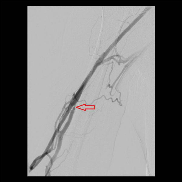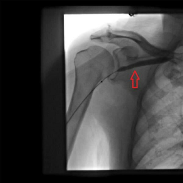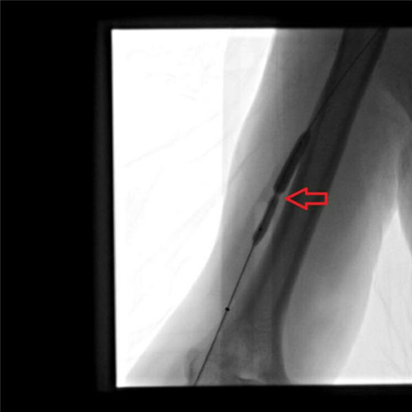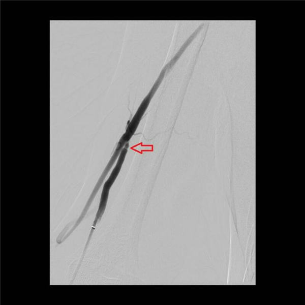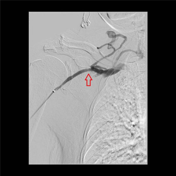 抱着将信将疑的态度,张老先生和家人找到了肿瘤微创介入科。陈力强主任和赵庆和主任在详细听了患者描述的症状后,经过进一步查体发现,张老先生右上肢动静脉瘘静脉端可触及明显血管震颤、可闻及明显血管杂音,考虑静脉存在狭窄的可能,建议行血管造影检查,如果确实有血管狭窄的情况,可以通过球囊扩张或者置入支架进行对症治疗。张老先生和家人一听有可能发现病因,并解决右肩疼痛的问题,决定由北京燕化医院肿瘤微创介入科进行医治。