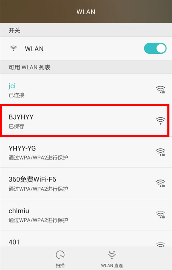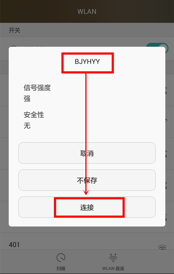 1、如下图,打开手机无线网,搜索“BJYHYY”并连接,即可弹出如下右图: