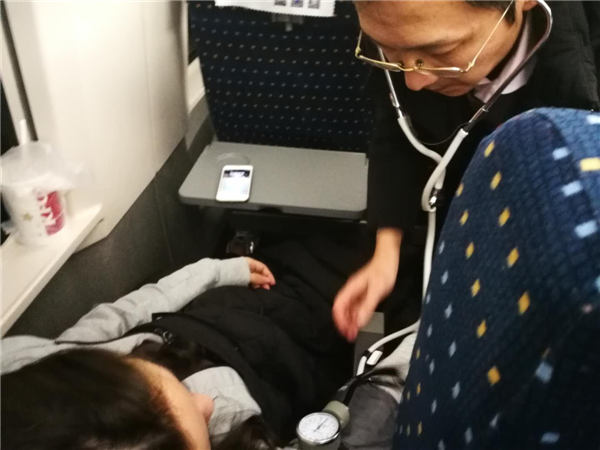 来到患者身边,只见一位20多岁的姑娘双眼紧闭、脸色发白。乘务员向程大夫简单说明了姑娘突感不适的一些情况,程大夫即刻为姑娘测量血压、号脉,并试图与姑娘进行对话,进一步问诊……