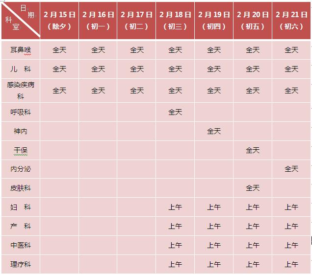 为方便广大患者朋友节日期间就医,我院就2018年2月15日-2月21日春节期间门急诊出诊时间通知如下: