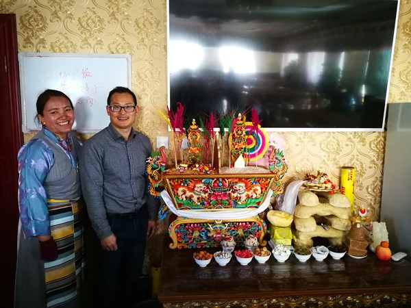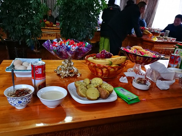 高反给了我们挑战,而尼木县的人们却让我们又一次地感受到了他们的热情。县委在元宵节前晚组织的新年团拜会,我们有幸受邀参加,一睹藏族同胞过藏历新年的盛况。食堂的藏桌围成一圈,每个桌上一盘各式各样、色彩艳丽的“卡赛”(酥油炸的面食),一盘当地的绿色食品炖土豆,每人一碗混着人参果的牦牛酸奶,还有喝不完的酥油茶。藏历新年最重要的仪式是轮流吃“切玛”(绘有彩色花纹的五谷斗,左右分别盛满炒麦粒和酥油拌成的糌粑,上面抽有青稞穗和彩花)。“切玛”象征丰收和吉祥,吃的时候很有讲究:先用右手拇指和食指抓起一小撮糌粑洒向空中敬天地(三次),然后左手拿起炒麦粒放进嘴里,最后分三口喝掉主人捧过来的一大碗家酿的青稞酒。当那大碗金黄清凉的青稞酒入肚,我已是酒不醉人人自醉。团拜会的高潮是敬献哈达——大家双手捧着洁白的哈达转着圈走,互送哈达,互道祝福:“新年快乐!扎西德勒!”此刻不存在高反,每个人脸上都洋溢着快乐的笑容,心里暖洋洋的。之后大家坐在一起进餐、敬酒,品尝着青稞酒、大口吃着原汁原味的手抓牦牛肉,幸福感爆棚。